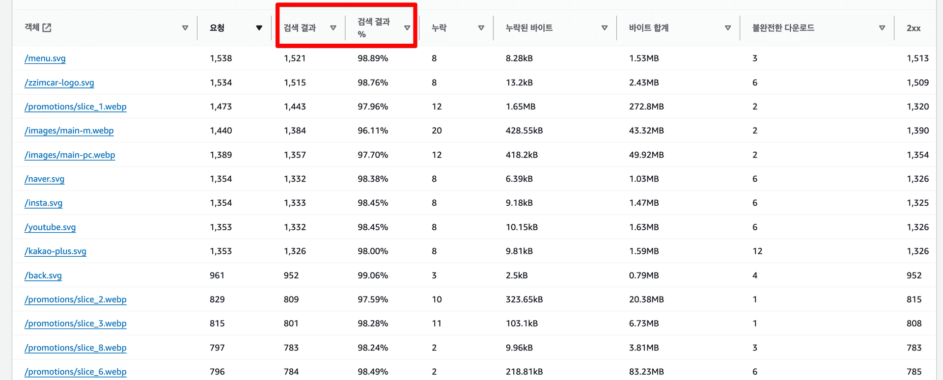 | 검색결과 (Hits) | Edge Location에서 캐싱된 객체가 제공된 사용자 요청 수이다. |