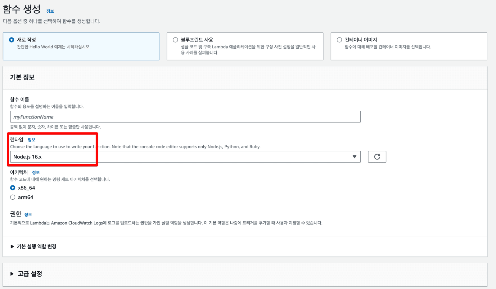 *Node.js16 런타임 환경으로 설정 시 aws sdk2가 사용되는데 sdk2는 cjs을 지원하여 해당 문법을 사용할 수 있습니다. Node.js18환경 설정 시 aws sdk3이 사용되어 esm 문법으로 함수를 작성한다는 점 유의하세요!