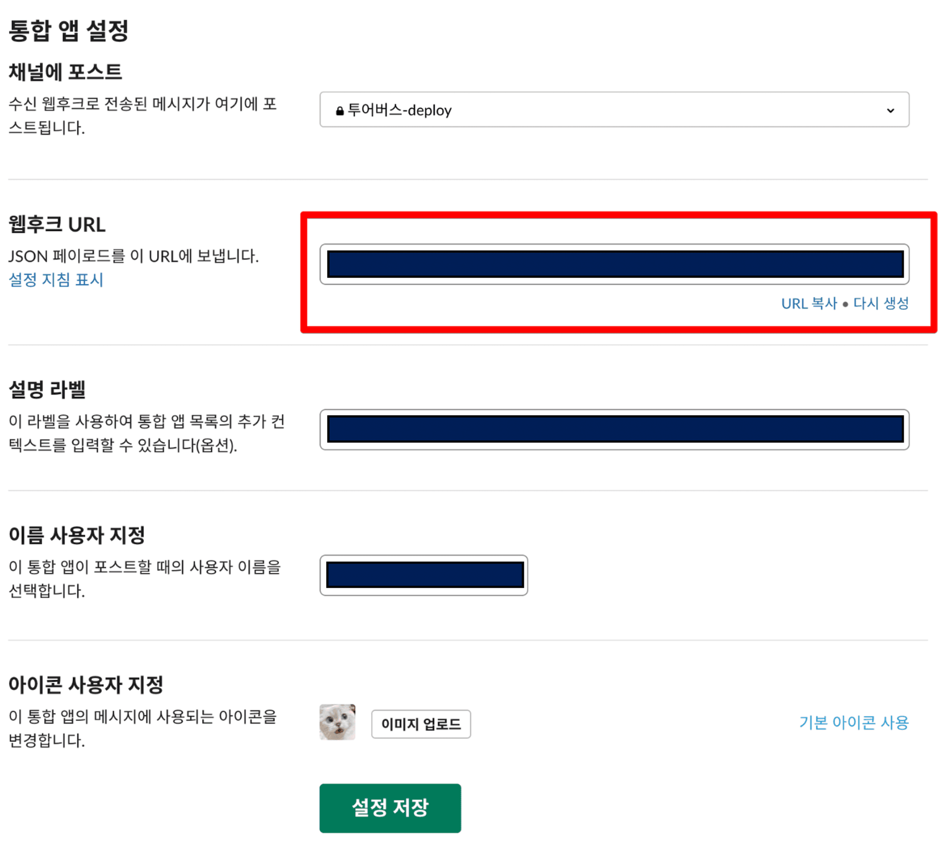 각 항목을 작성 후, 웹훅 url을 복사합니다.
