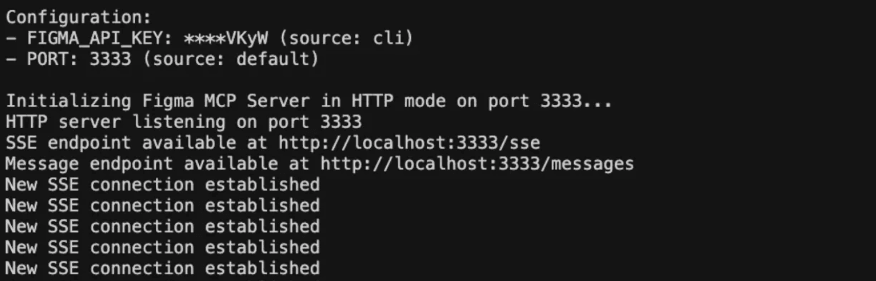 npx figma-developer-mcp --figma-api-key=<여기도 피그마 토큰을 넣어주세요>5. 그러면 아래 화면처럼 로컬 서버가 실행됩니다.