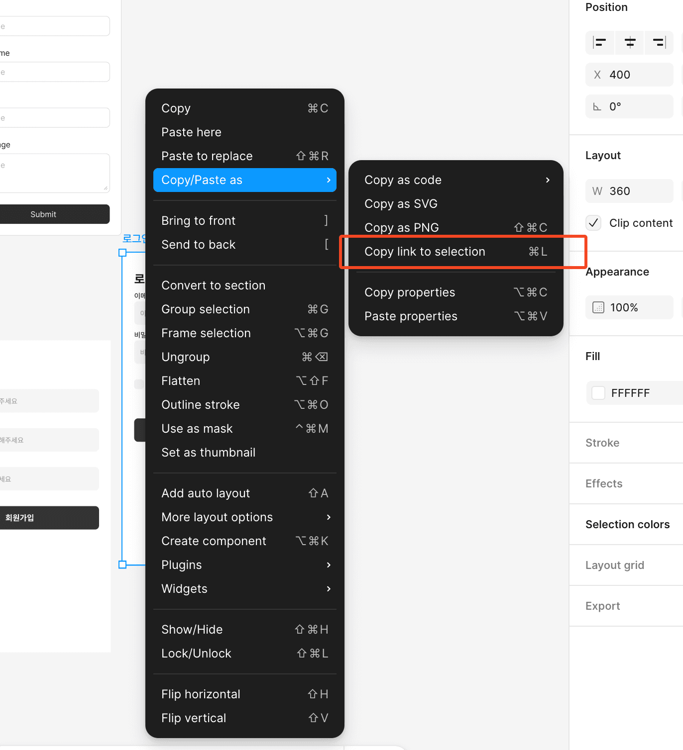 10. 이제 자유롭게 피그마 특정 페이지 혹은 요소의 link를 복사하여 Cursor Chat에 붙여넣어보세요!