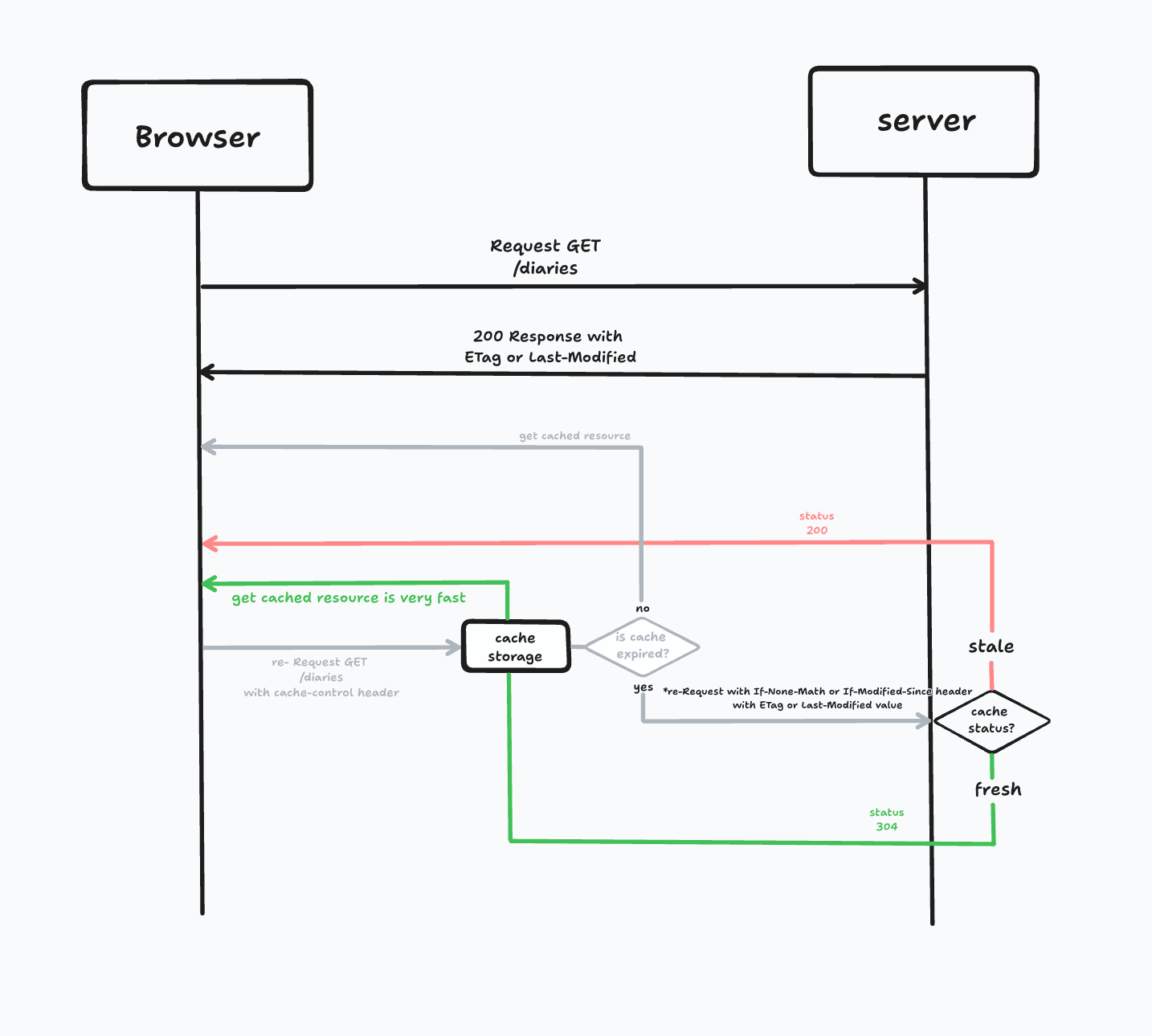 서버는 리소스에 대한 만료 시간을 알려주는데, 만료 시간 이전에는 리소스가 유효(fresh)하고, 만료 시간 이후의 소스는 실효(stale)됩니다. 캐시가 stale한 리소스에 대한 요청을 받은 경우, 이 리소스가 유효한지 확인을 위해 If-None-Match와 함께 요청을 전달합니다.