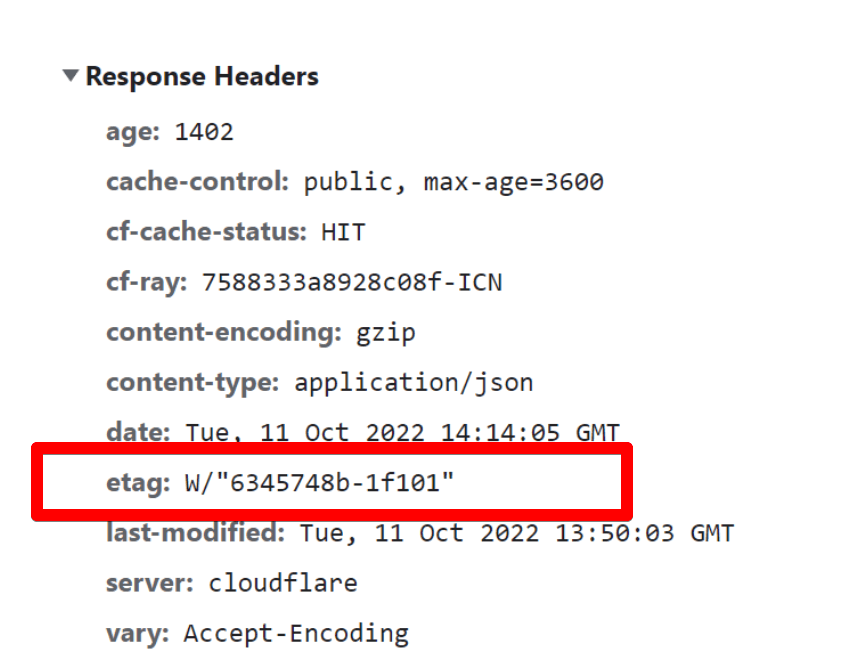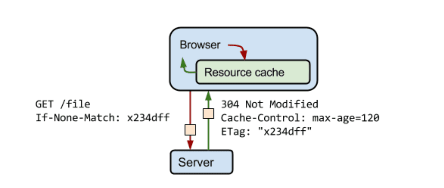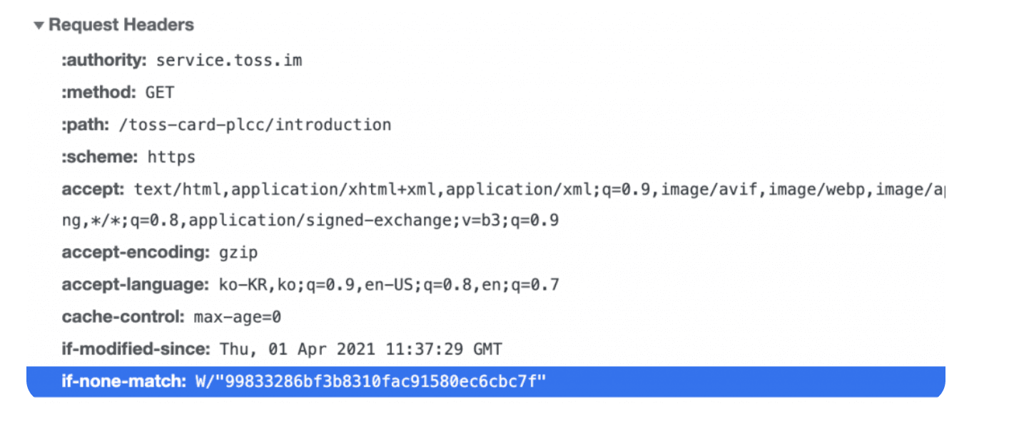 만약 수정되지 않는 리소스에 대한 요청시, 리소스 없이 304 응답을 하게 됩니다. 이전 요청의 Last-Modified 응답 헤더는 마지막으로 수정 한 날짜를 포함합니다.