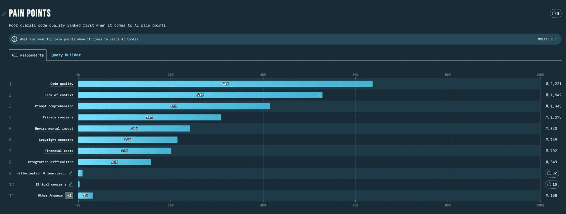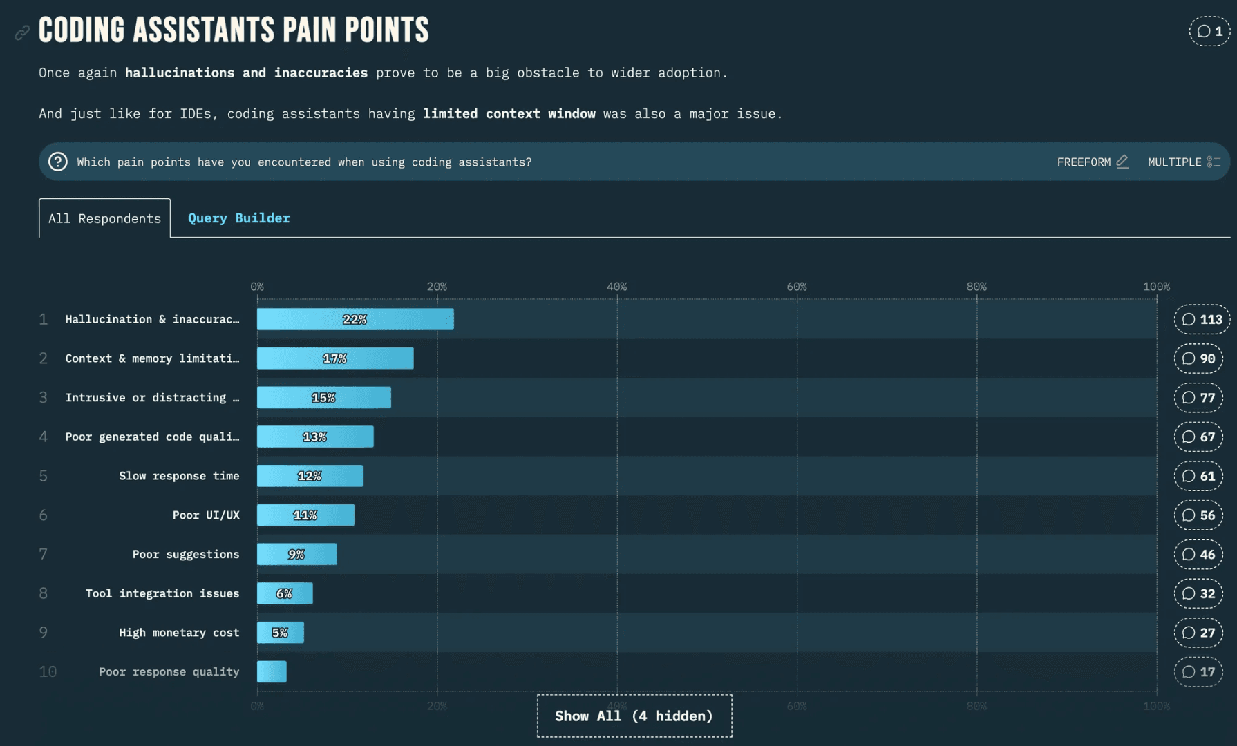 코딩 어시스턴트를 사용하는 개발자들이 꼽은 가장 큰 Pain Point 1위는 바로 "환각(Hallucination)과 코드 퀄리티”였습니다.