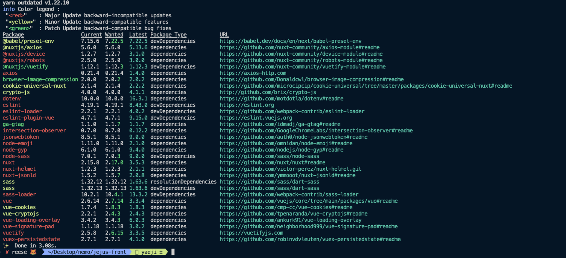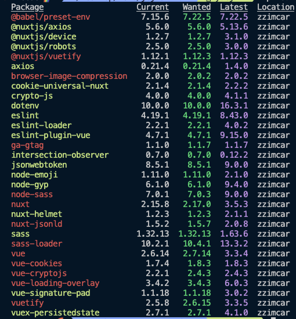 npm outdated의존성 모듈 중에 업데이트가 필요한 모듈을 확인할 수 있다. 업데이트가 필요한 모듈만 정리되어 나온다.