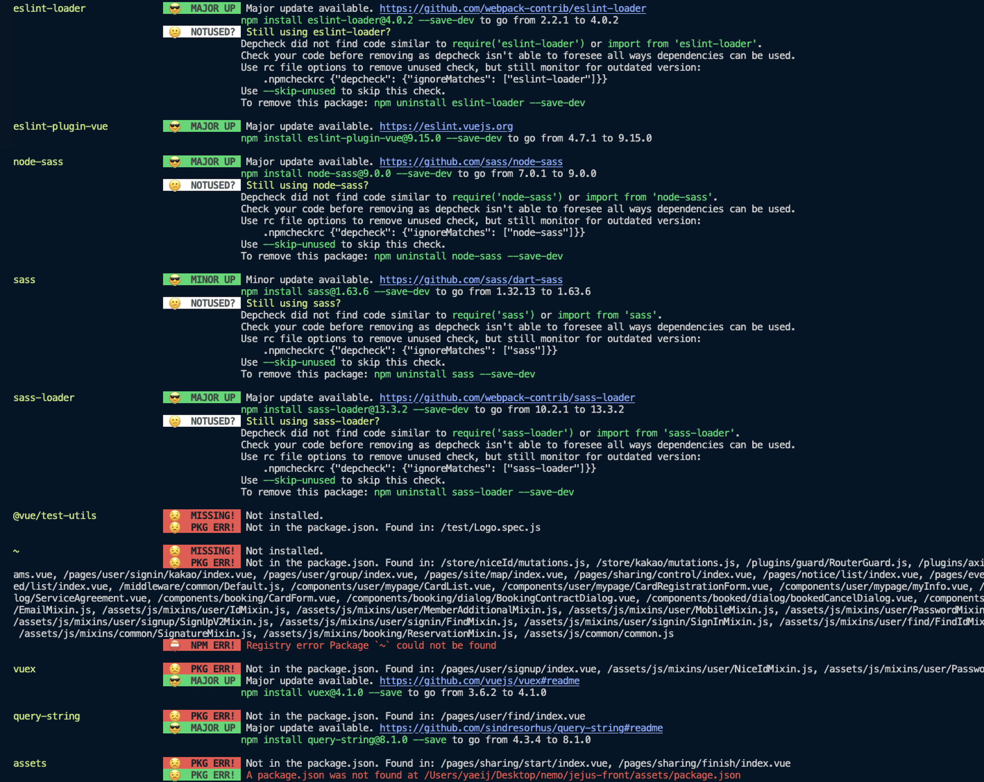 npm list --depth=1업데이트가 필요한 라이브러리들을 확인할 때