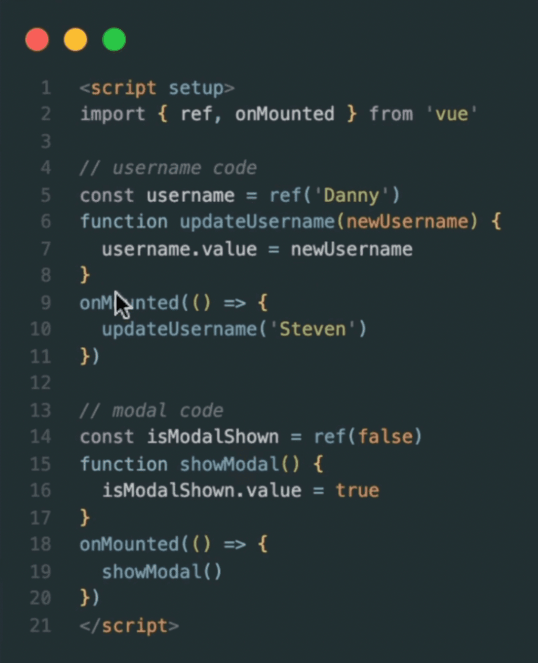 }Options API에서는 created, mounted 등의 생명주기 훅을 직접 컴포넌트 옵션에 정의했지만, Composition API에서는 onMounted, onCreated 등의 함수를 사용하여 생명주기 훅을 설정할 수 있습니다.