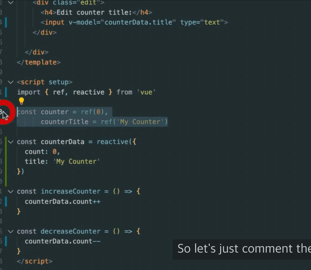 ref와 reactive 함수를 사용하여 반응형 데이터를 생성합니다. ref는 기본 타입을 반응형으로 만들 때 사용하고, reactive는 객체 타입을 반응형으로 만들 때 사용합니다.
